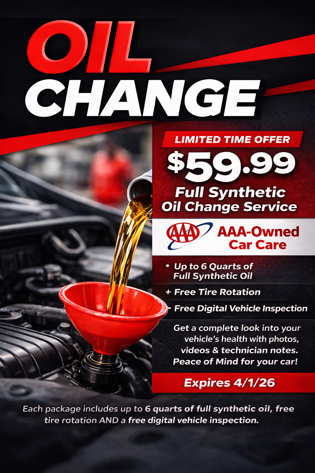 Our oil changes offer you more then just oil. Each package includes up to 6 quarts of Full Synthetic oil, a free tire rotation AND a free digital vehicle inspection. This inspection will give you a full look into the complete health of your vehicle and includes photos, videos and technician notes on our findings. You don't have to guess about its health -- you'll get Peace of Mind and be able to take maintenance decisions into your hands. Expires 4/1/26